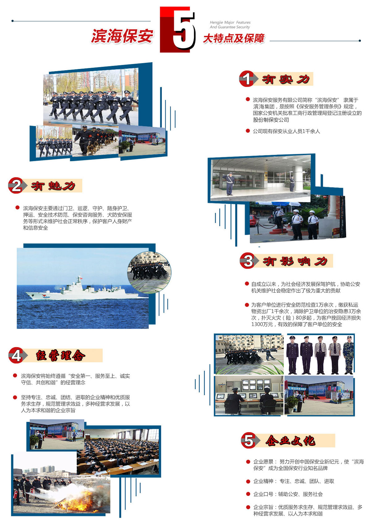 濱海保安主要通過門衛(wèi)、巡邏、守護(hù)、隨身護(hù)衛(wèi)、押運(yùn)、安全技術(shù)防范、保安咨詢服務(wù)、犬防安保服務(wù)等形式來維護(hù)社會(huì)正常秩序,保護(hù)客戶人身財(cái)產(chǎn)和信息安全。公司現(xiàn)有保安從業(yè)人員1千余人,客戶單位涵蓋黨政機(jī)關(guān)、企事業(yè)單位、金融機(jī)構(gòu)、高檔寫字樓、賓館飯店、高檔別墅、高等院校、大型商場、建筑行業(yè)等,現(xiàn)有單位100余家。